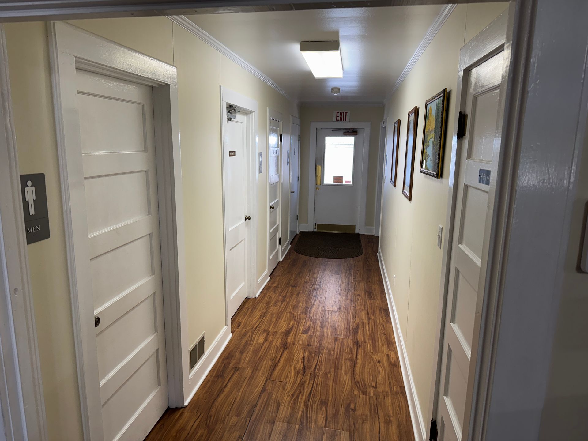 The hallway, which is just south of the lobby, has three bathrooms. Each of which is single-occupancy, allowing for more privacy.